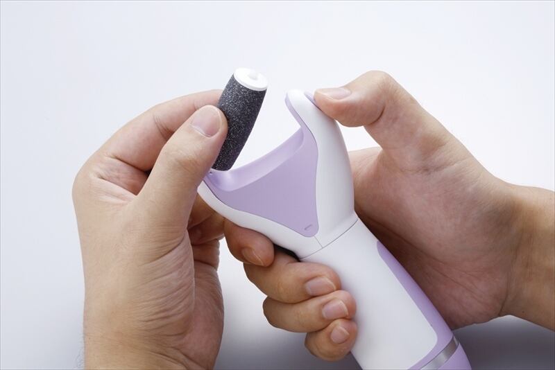 なでるだけでスピーディに角質を除去する電動リムーバー。人工ダイヤモンドパウダー入りローラーヤスリ。電池式で好きな場所で使えます。