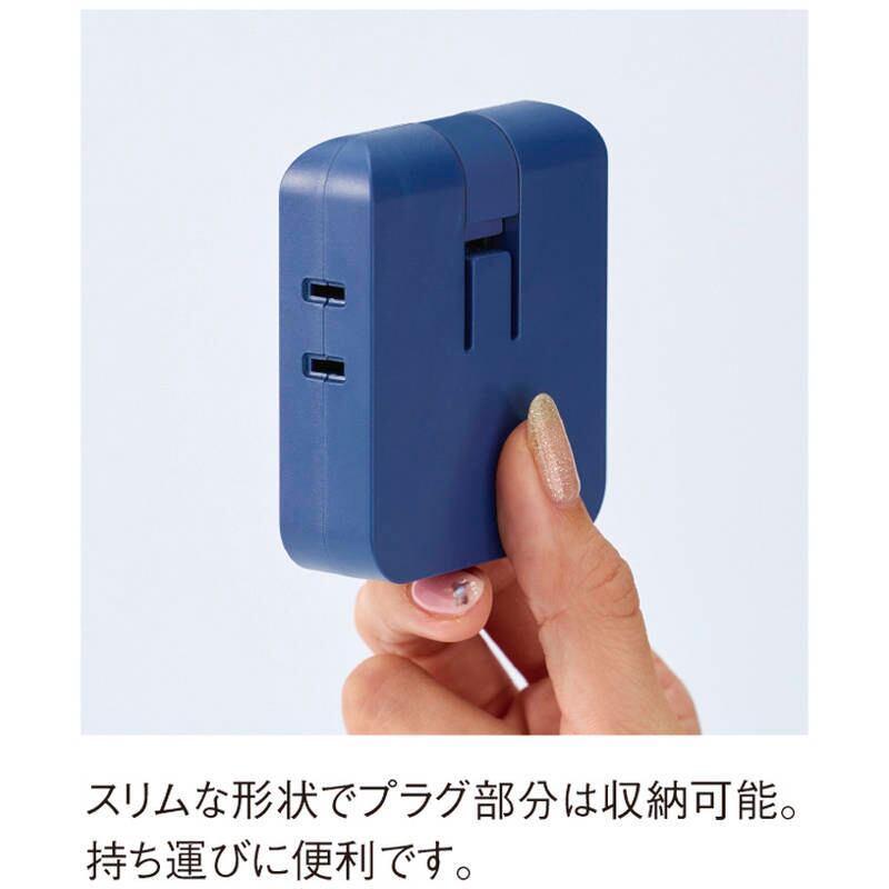 変換アダプターが不要なため、充電環境がスマートに。スリムな形状でプラグ部分は収納可能。USB2ポートとコンセント2口搭載でコンセントとUSBを同時に使用可能。